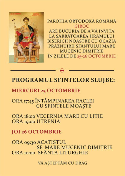 Parohia Ortodoxă Română din Giroc are bucuria de a vă invita la sărbătoarea hramului bisericii noastre cu ocazia prăznuirii sfântului mare mucenic Dimitrie în zilele de 25-26 octombrie 2017.
