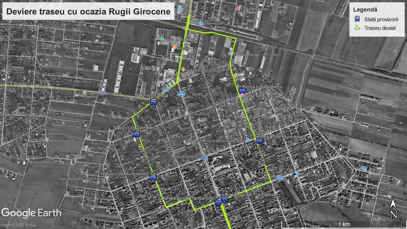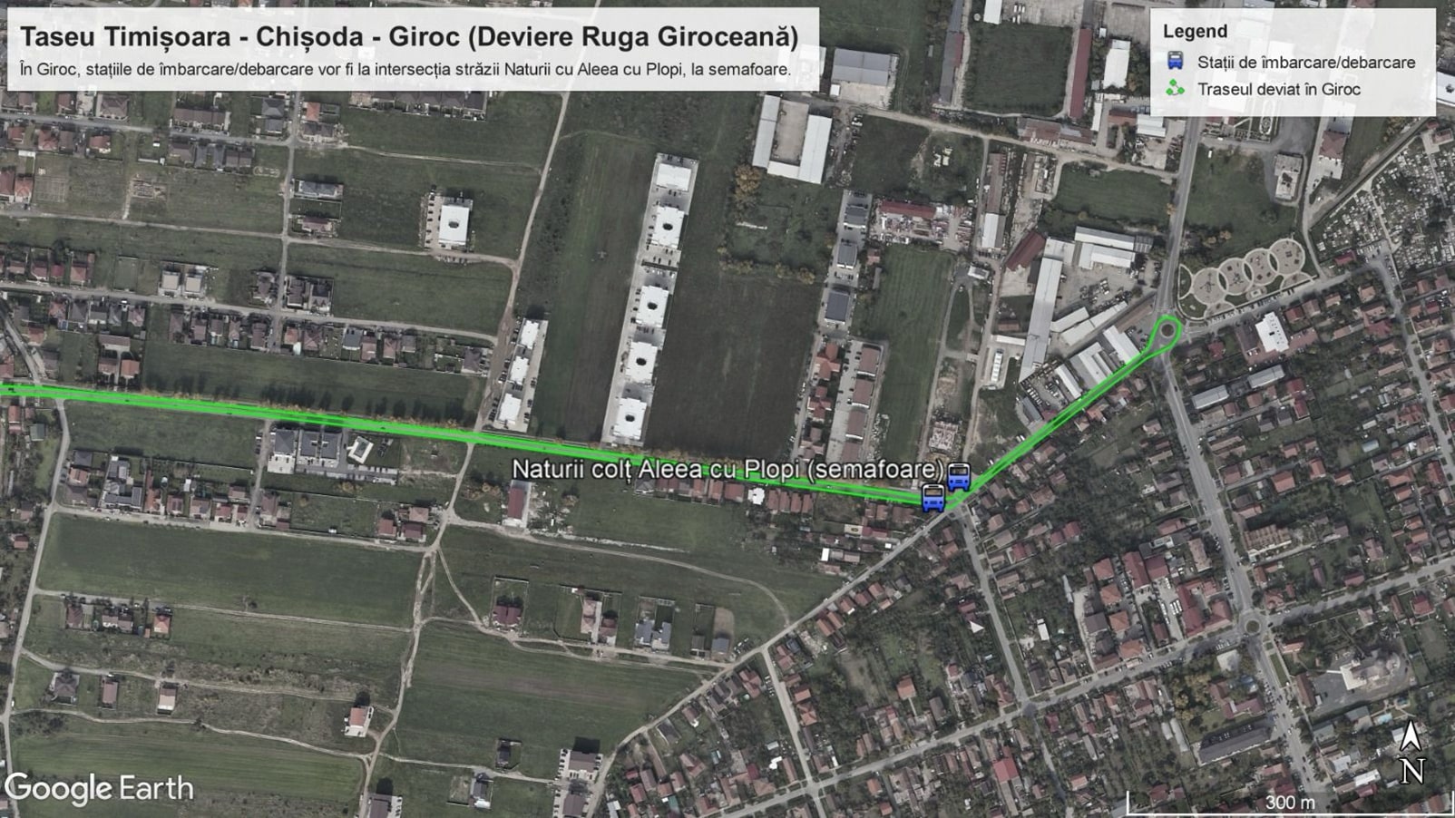 În plus, traseul Chișoda – Timișoara va fi extins temporar până în Giroc. Totuși, autobuzele care tranzitează strada Trandafirilor din Giroc vor fi deviate pe străzile Carpați și Gloria, iar stațiile de îmbarcare și debarcare vor fi reconfigurate conform noii rute. Iată lista completă a stațiilor pentru traseul deviat: