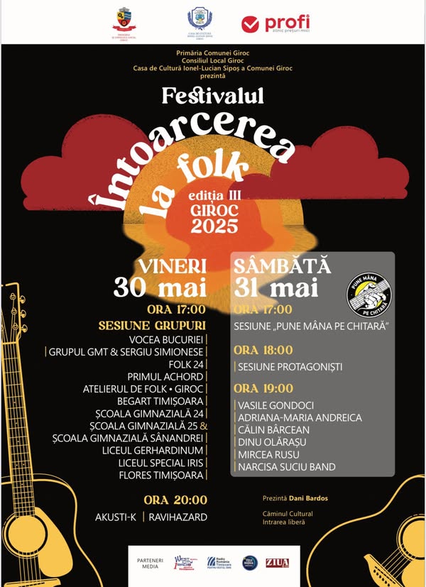 Festivalul „Întoarcerea la Folk” reunește din nou, la Giroc, muzica sufletului. Ajuns la a III-a ediție, evenimentul se desfășoară pe 30 și 31 mai, la Căminul Cultural, și aduce în fața publicului un program divers și emoționant, cu acces gratuit. Este o invitație deschisă către toți cei care iubesc folkul sau vor să-l descopere.