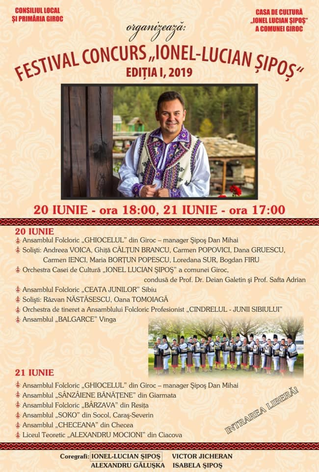 În organizarea Consilului Local și al Primăriei Giroc, respectiv a Casei de Cultură Ionel Lucian Șipoș a Comunei Giroc, în zilele de 20 și 21 iunie 2019 va avea loc prima ediție a Festivalului Concurs Ionel Lucian Șipoș, eveniment creat ca omagiu adus celui care a fost sufletul ansamblului GHIOCELUL. Dedicat trup și suflet activităților organizate la ansamblul Ghiocelul, Neluțu a reprezentat Girocul cu mândrie, promovând imaginea comunei noastre prin intermediul deosebitelor evenimente culturale la care a participat împreună cu colegii și prietenii săi! Astfel, acest festival a luat naștere în semn de apreciere pentru devotamentul său și sperăm să devină în timp un reper în viața culturală a Banatului. Este totodată un mod de a duce mai departe munca sa!!!